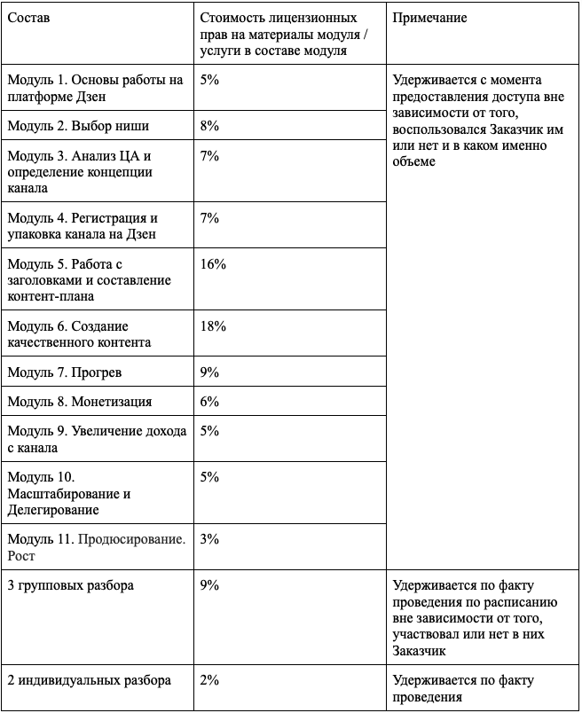 | Программа | — структура и содержание курса по Авторскому методу Игоря Градова № 1 в Дзен. Стоимость каждого варианта курса определяется по отдельному тарифу. Содержание программы и ее наполнение раскрыто Исполнителем в Приложениях и (или) на сайте. Исполнитель вправе вносить изменения в программу, существенно не изменяющие содержание и структуру. График реализации программы размещается на платформе. |