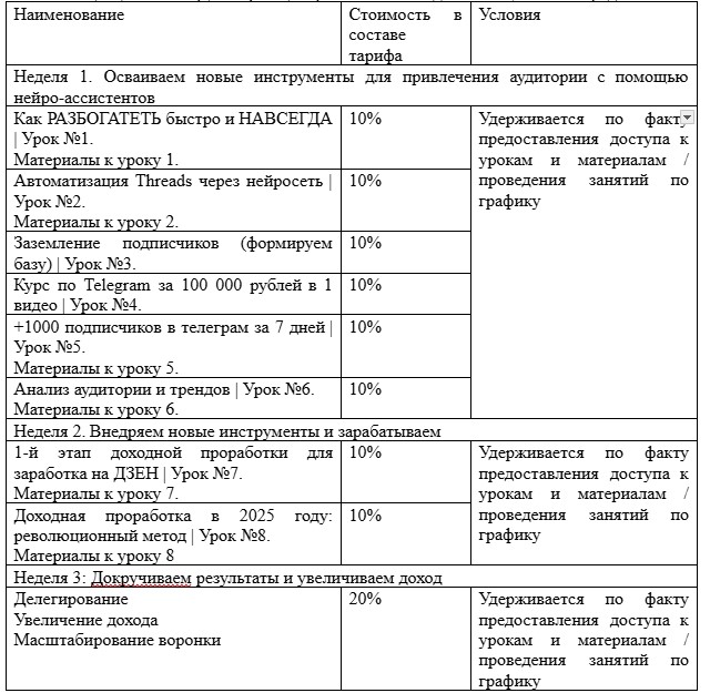 | Услуги | — оказание платных услуг по обучению программе «Нейрокэш» (© Градов Игорь Владимирович, все права защищены, 2024-2025). Услуги направлены на удовлетворение потребностей Заказчика в получении информации о возможностях дохода с использованием нейросетей. |