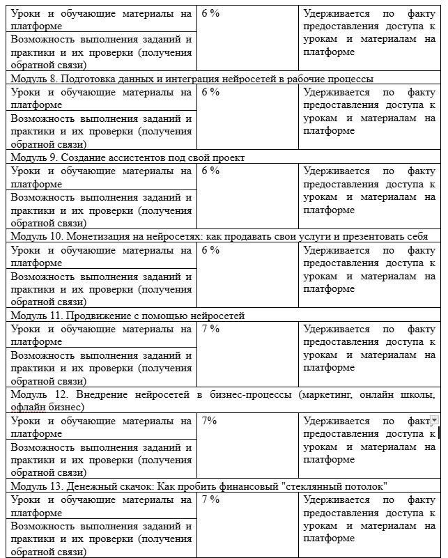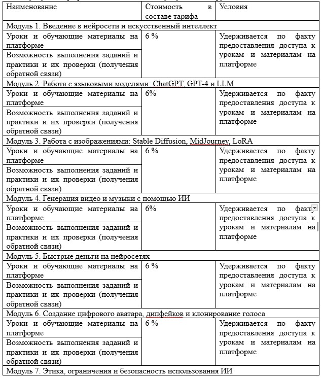 Онлайн-курс направлен на удовлетворение потребности Заказчика в получении информации возможностях дохода с использованием нейросетей. Целью Заказчика является дальнейшее самостоятельное осуществление предпринимательской деятельности или деятельности в качестве самозанятого (плательщика налога на профессиональный доход) для получения дохода, поэтому заказчики не являются потребителями по смыслу Закона РФ от 07.02.1992 N 2300-1 «О защите прав потребителей».