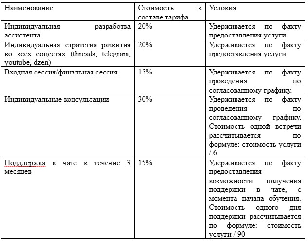 — Стоимость оказанных на дату получения Исполнителем заявления о возврате услуг (стоимость модулей, к которым открыт доступ, проведенных занятий). Стоимость оказанных услуг рассчитывается согласно Приложению № 2.